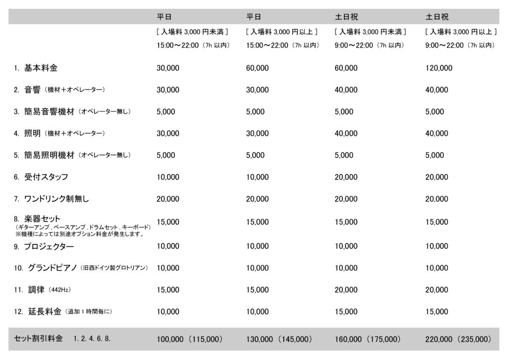 ・セット料金はPA、照明、設備使用料、受付、ホールスタッフ人件費込みです。