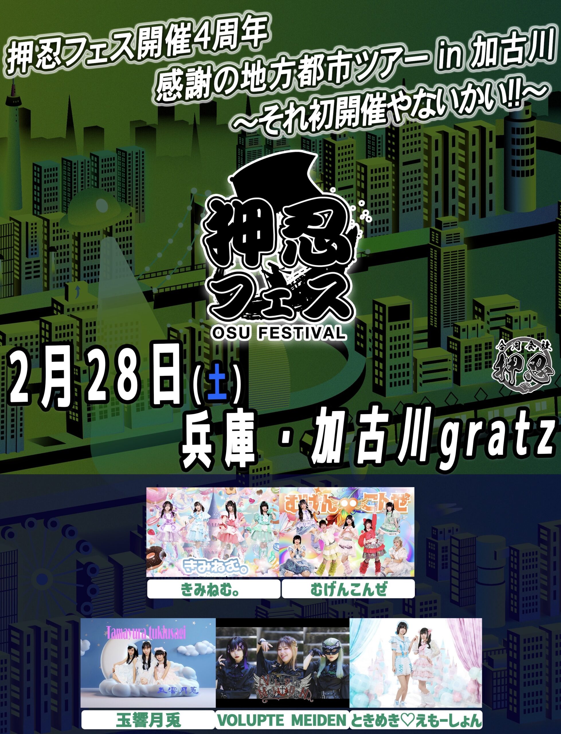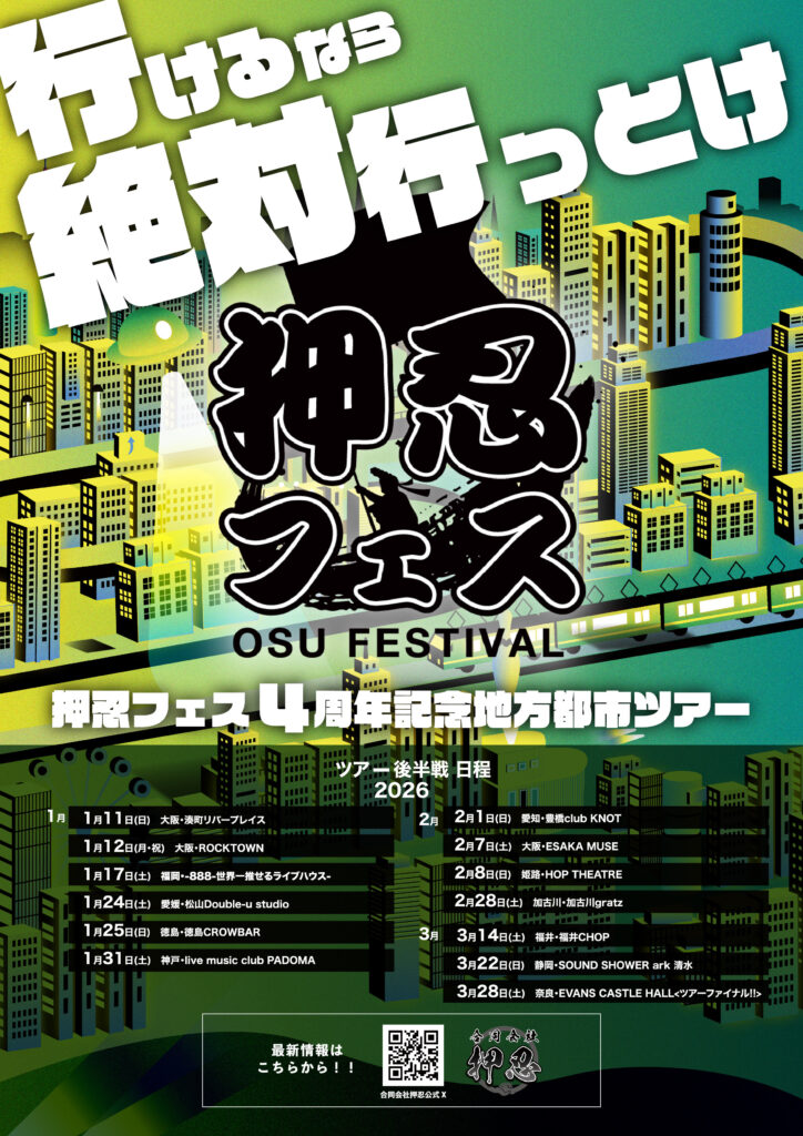 2026年2月28日(土)押忍フェス 2026 1/16 LIVE情報 PICK UP! 〈出演〉むげんこんぜ/VOLUPTE/MEIDEN/きみねむ。/玉響月兎/ときめき♡えもーしょん …and more!! ※詳細は今月末お知らせいたします! 〈主催〉合同会社押忍 LIVE情報 PICK UP! よかったらシェアしてね! URLをコピーしました! 2025年12月6日(土)『IT'S "69.6" MILES TO KAKOGAWA vol.1』 2026年1月23日(金)知久寿焼 関連記事 10月5日(土)ダイアモンド☆ユカイ【SOLD OUT!】 2024年8月23日 10月9日(水)みわトシ鉄心 2024年8月23日 10月10日(木)木村充揮 2024年8月23日 10月11日(金)三宅伸治 2024年8月23日 10月13日(日)THE NEATBEATS × GASOLINE 2024年8月23日 10月17日(木)知久寿焼 2024年8月23日 10月27日(日)ホフディラン 2024年8月23日 10月29日(火)小堀裕之(2丁拳銃) × 旭堂南歩 2024年8月23日