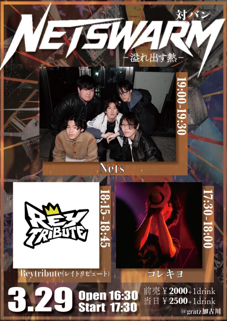 『Netswarm対バン -溢れ出す熱-』 〈出演〉Nets/Reytribute/コレキヨ ...and more 〈時間〉open 16:30/start 17:30 〈料金〉前売 2,000円/当日 2,500円 (要別途1ドリンクオーダー) ※小学生以下入場無料 ◉メール予約 ▶︎ yoyaku@gratz.jp ... -