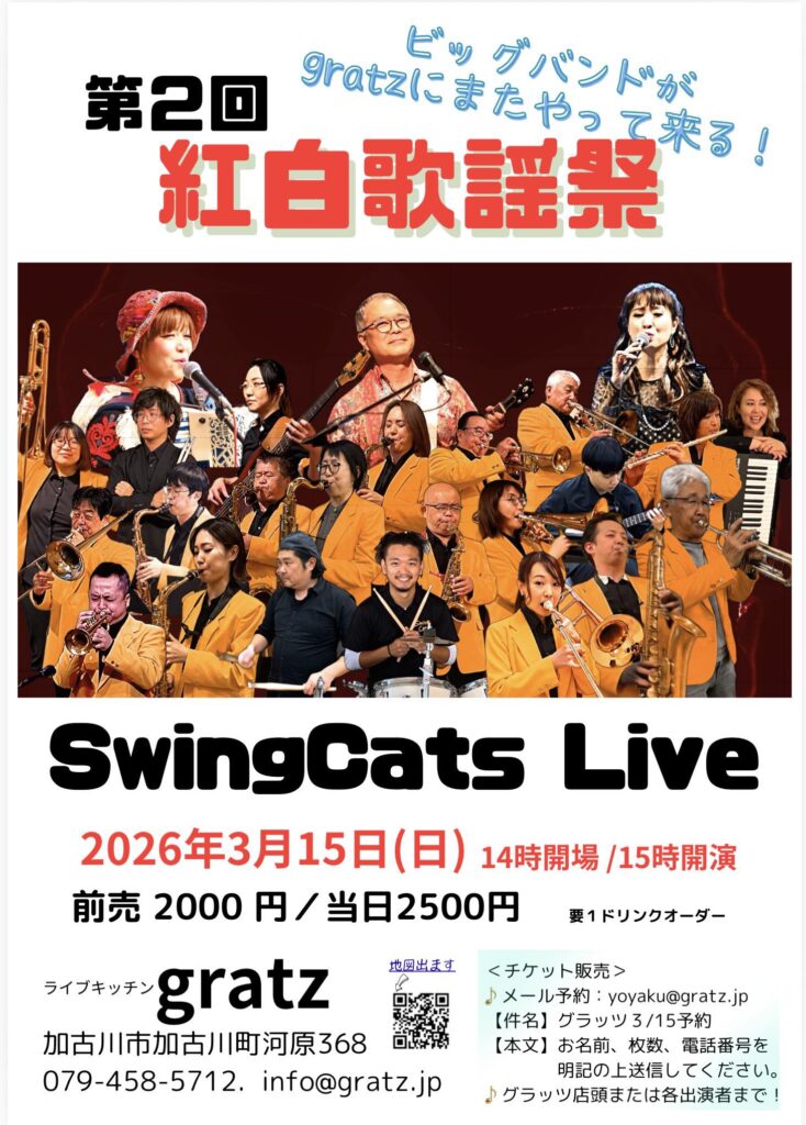 ビッグバンドがgratzにまたやって来る! 第2回『紅白歌謡祭』Swing Cats Live 〈出演〉Swing Cats 〈時間〉開場 14:00/開演 15:00 〈料金〉前売 2,000円/当日 2,500円(要1ドリンクオーダー) ※小学生以下入場無料 〈チケット販売〉 ◉ ... -